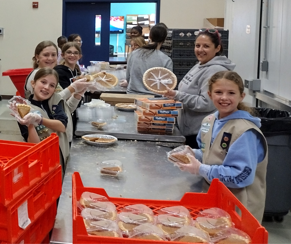 Before we package up the pies, Girl Scouts of Western Ohio troops help us slice pies to give to seniors. Each of our clients who receives home-delivered meals will receive a slice with their weekly meal delivery. We will also send pies to our senior center partners to serve during group meals for Thanksgiving.