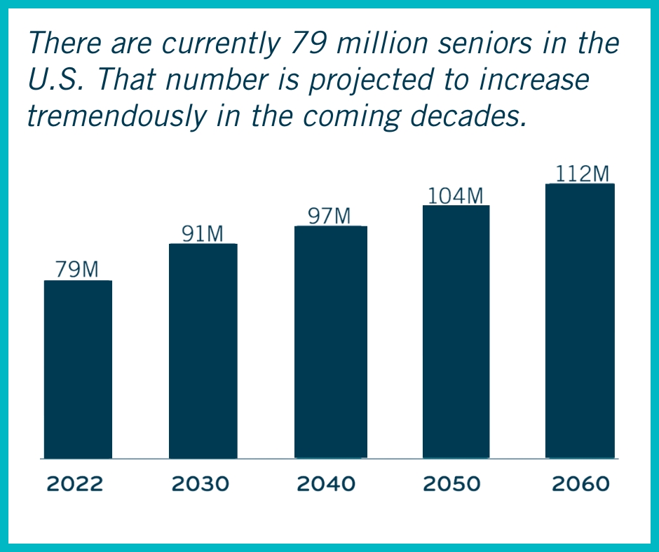 The number of Americans aged 60 or older is growing rapidly—roughly 12,000 individuals turn 60 each day. With it, the demand for services to support those seniors is also growing. Senior population growth outpaces younger generations, leading to heightened age dependency.