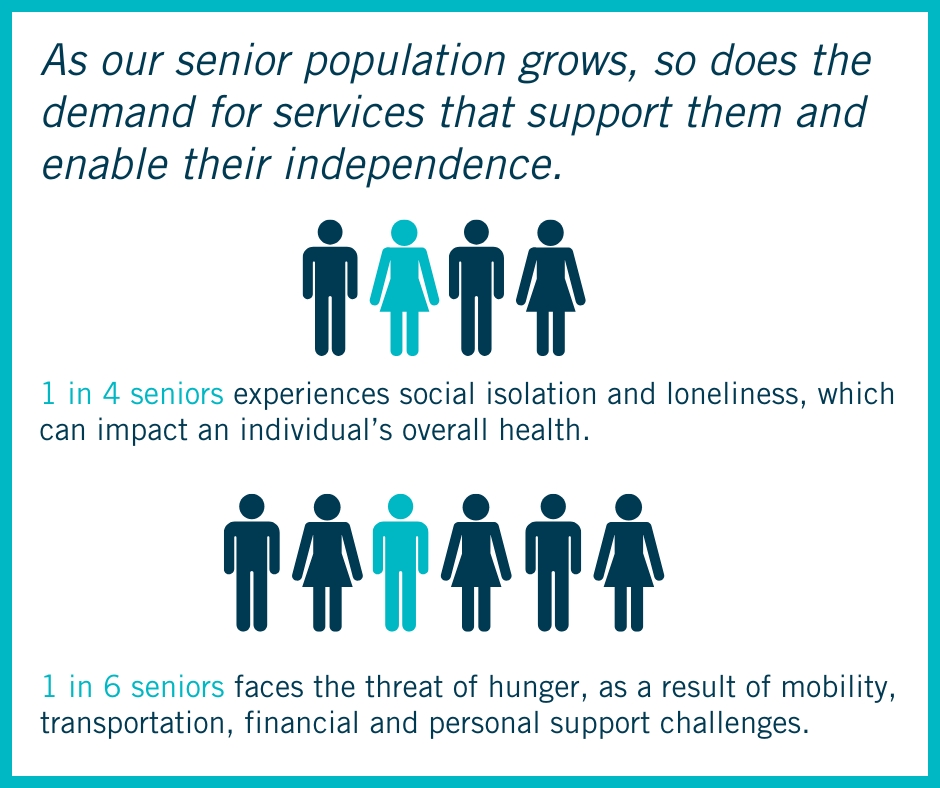Every meal delivery and program engagement embodies compassion, support, service and connections for our seniors in three key areas.